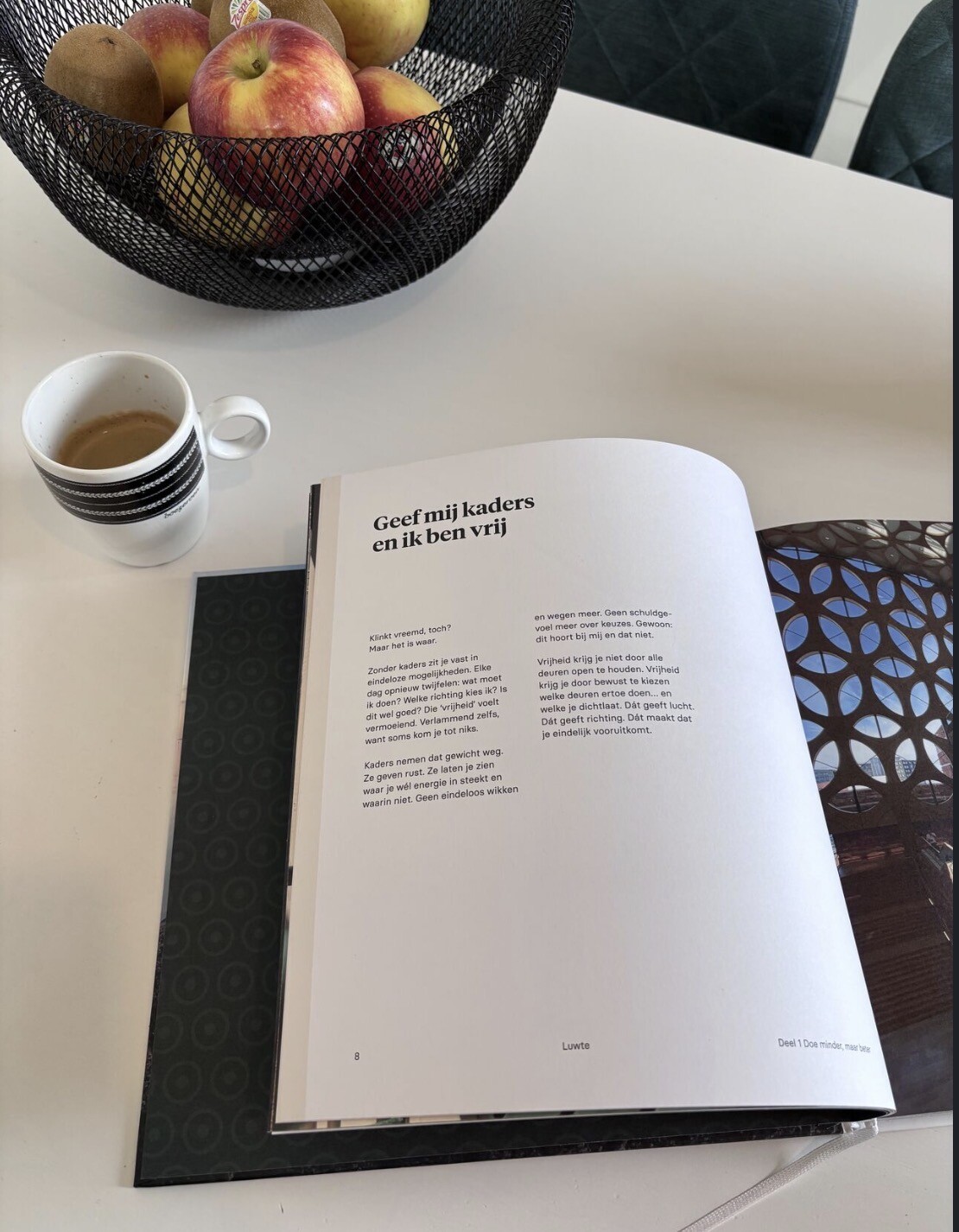 Een koffietafelboek is te mooi om in de boekenkast te zetten. Daarom laat je het altijd op de koffietafel, salontafel of keukentafel liggen. Of op een mooi plankje. Een koffietafelboek is een boek dat je niet van voor naar achter leest, maar waar je willekeurig in bladert. Het ligt op de tafel, je pakt het op tijdens een koffiepauze zonder moeten, vindt inspiratie en legt het weer weg. Precies wat Luwte wil zijn voor jou: momenten van rust pakken wanneer je ze nodig hebt. En het ziet er ook nog interieurwaardig uit.