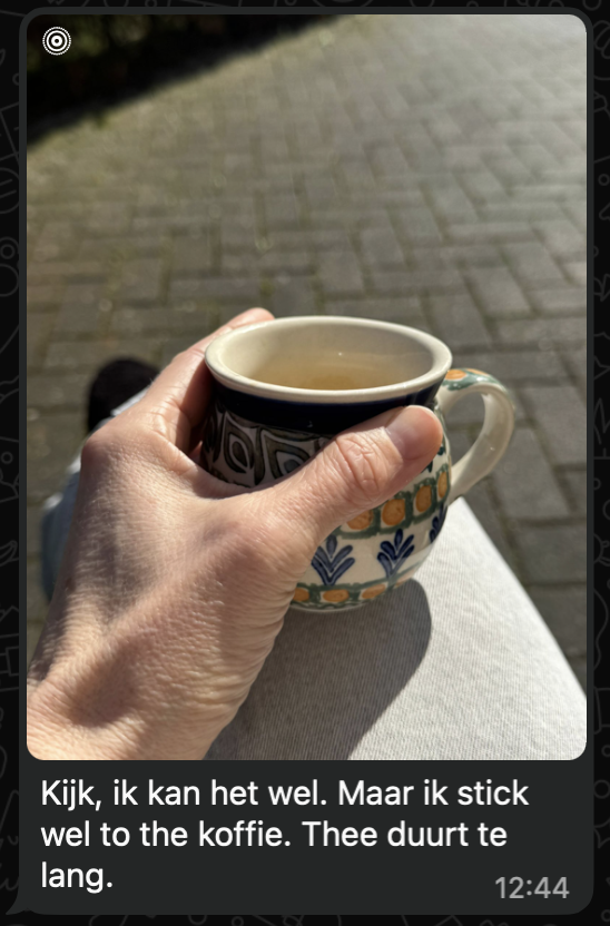 In mijn creatieve werk merk ik hoe belangrijk die momenten zijn. Die mijmertijd met koffie of tijdens een wandeling is namelijk waar de doorbraak schuilt. Waar plotseling het idee komt dat wél werkt.